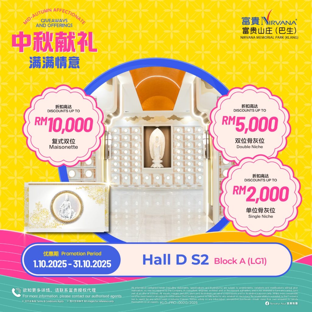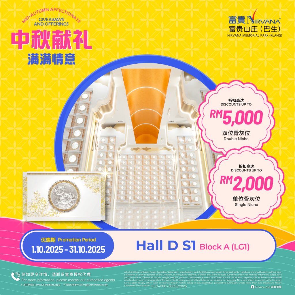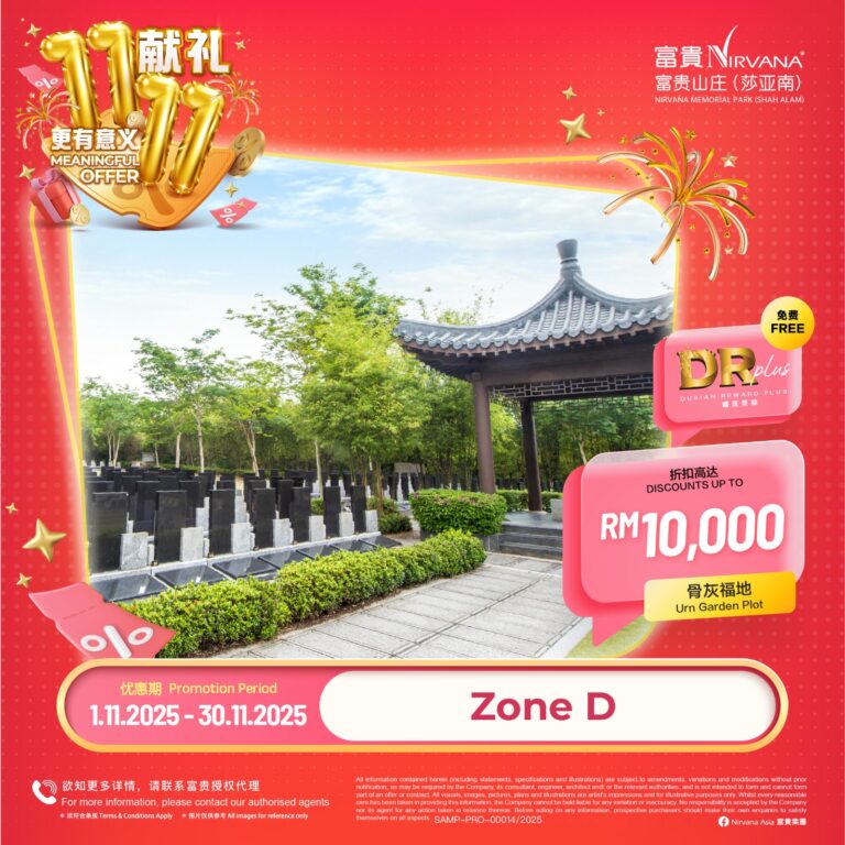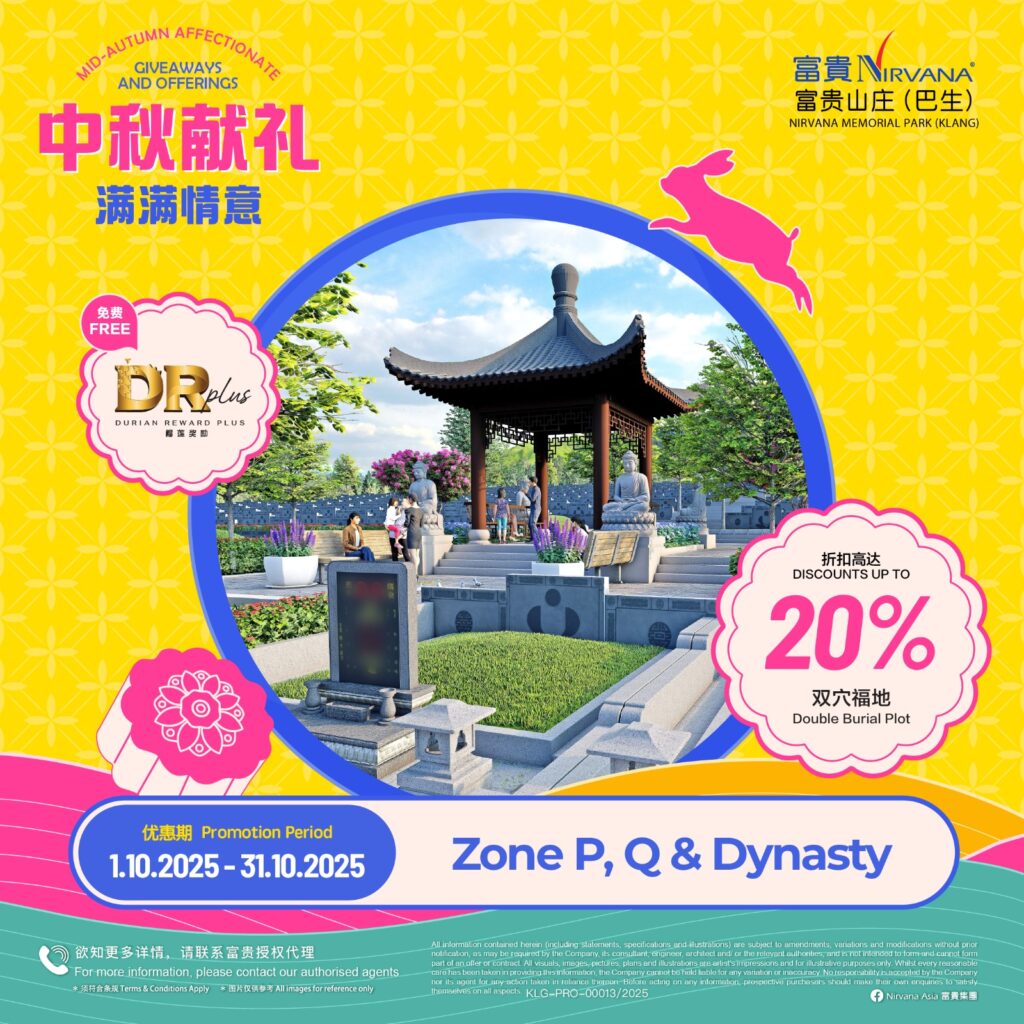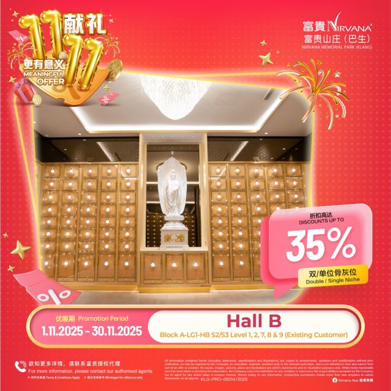 As with all of Nirvana’s memorial parks, this memorial park has a wide array of choices in terms of burial plots and columbaria that cater for multiple denominations. Regardless of spiritual beliefs, filial piety forms the core tenet of Asian society and it is this key value that Nirvana Memorial Park (Klang) looks to in creating a place where everyone can come home to rest and be at peace with loved ones. Like falling leaves returning to the roots, those gone before become the foundation that strengthens the tree in an endless cycle of growth and renewal.